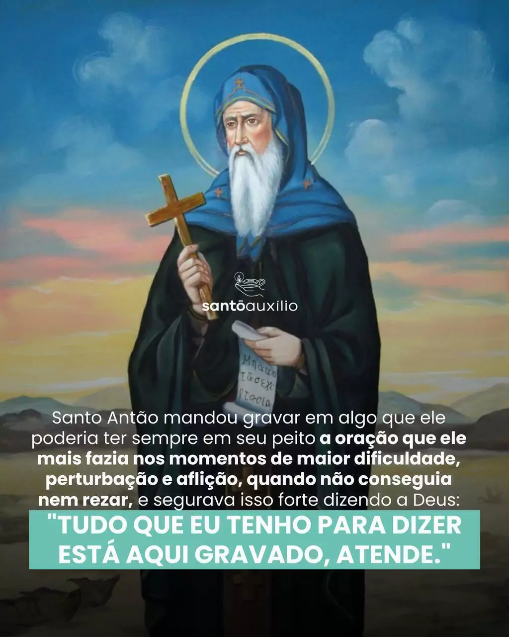 História: Santo Antão mandou gravar em algo que ele poderia ter sempre em seu peito a oração que ele mais fazia nos momentos de maior dificuldade, perturbação e aflição, quando não conseguia nem rezar, e segurava isso forte dizendo a Deus: “Tudo que eu tenho para dizer está aqui gravado, atende.” Outro Santo, São Bento, diante de um grande obstáculo, proferiu uma forte oração, a famosa oração de São Bento, e fez o sinal da cruz até que o obstáculo fosse removido. Esta medalha surgiu graças a essas orações, e por ter uma cruz de cada lado, chama-se medalha das 2 cruzes: de um lado está uma oração poderosíssima de proteção e exorcismo que clama a Deus para que Ele mande o mal para longe de nós, é um pedido de proteção divina sobre a nossa vida; e do outro lado está a promessa de Deus no Salmo 90: “Porque quem se uniu a mim eu o livrarei e o protegerei”. Então, tenha ela sempre consigo, e quando precisar, diante de quaisquer pensamentos, sentimentos, obstáculos, preocupações, perturbações de sono, contra o ciúme, a inveja e todos os males, mesmo que não consiga rezar, segure-a firme. Não é a medalha em si, é o que ela significa diante de Deus e o que nós assumimos diante de Deus. Levar consigo esta medalhinha é uma poderosa oração. A Santa Cruz do Senhor desperta algo de Deus em nós e nos desperta para Deus.